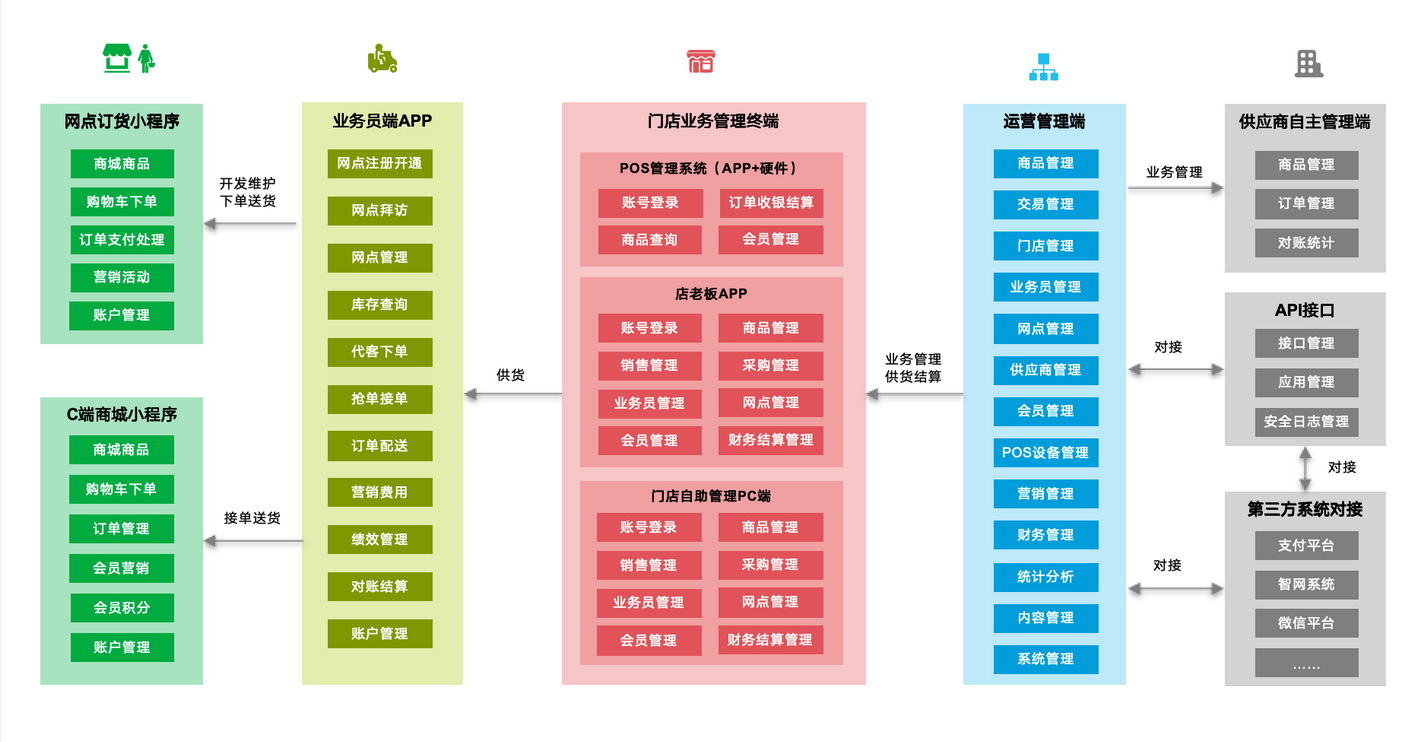 網(wǎng)點(diǎn)小程序、商城小程序、業(yè)務(wù)員APP、門店P(guān)OS、門店APP、門店P(guān)C管理端、運(yùn)營(yíng)PC管理端、供應(yīng)商PC管理端。